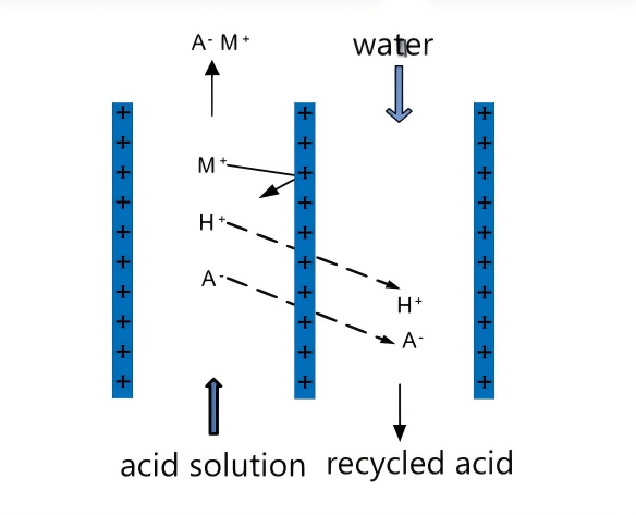 The diffusion dialysis process takes concentration difference as the driving force, and uses the selective permeability of (anion) cation exchange membranes to (acid) alkali and high retention of salts or other components to separate (acid) alkali from salts or other components in the solution. The separated alkali (acid) solution is reused in the production process.
